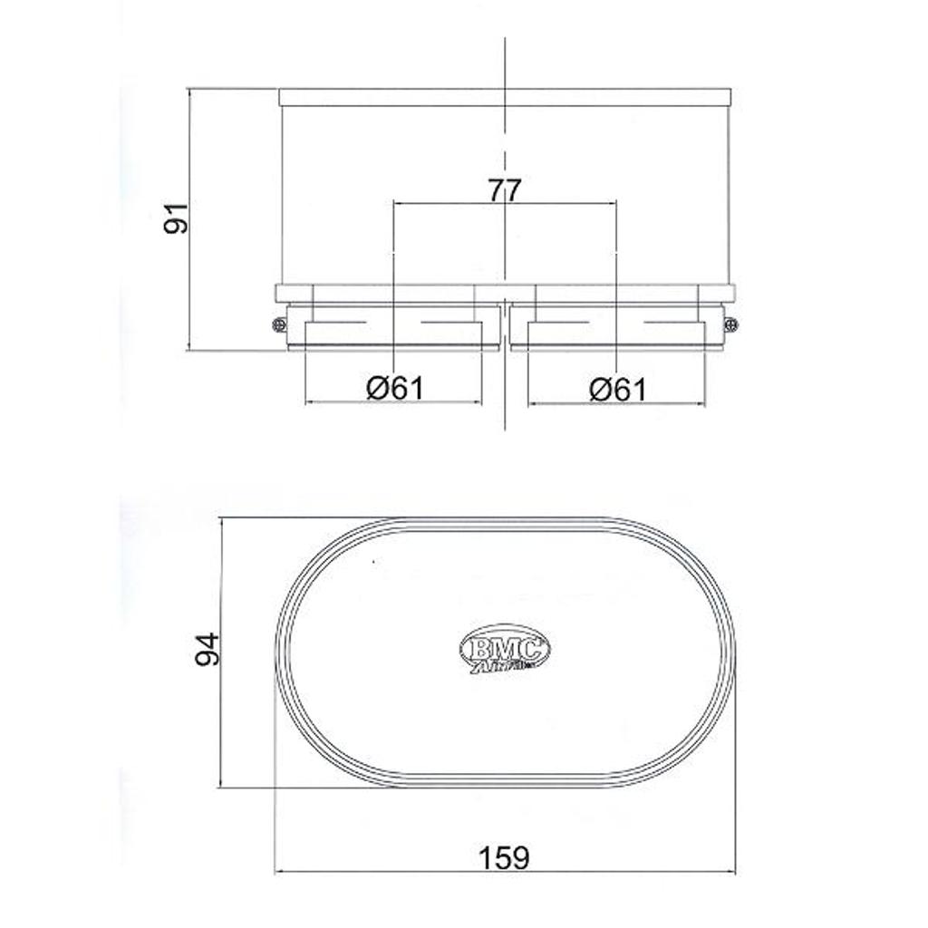 CUSTOM / RACING APPLICATION - Universal Dual Oval Set with two individual elements supplied. Dimensions: Oval 159mm x 94mm / Overall Height 91mm / Inlet Mounting Diameter: 61mm / Distance between Centre of Inlet Mounts: 77mm. Check dimensions for suitable fitment to your particular Make & Model. BMC air filters are designed as a performance accessory item.