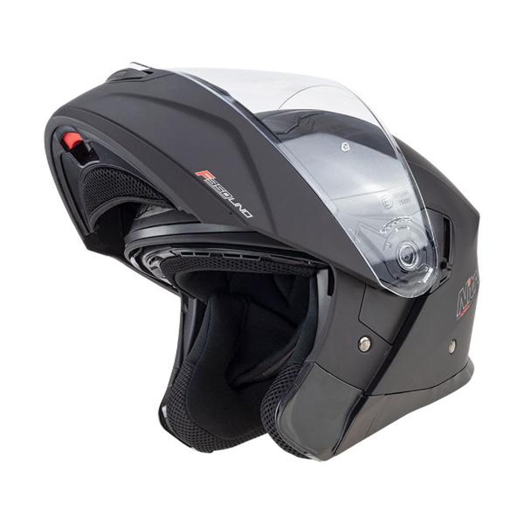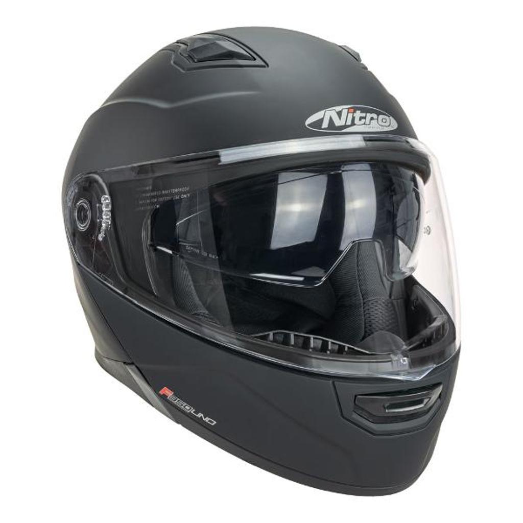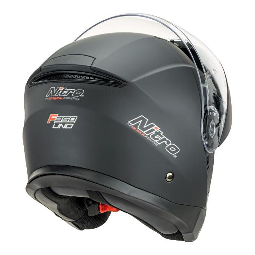 The F350 is Nitro's new modular offering, providing safety, comfort, and practicality, with an integrated pivoting chinbar and visor, itself an injection-molded item which is pinlock-ready with anti-scratch coating. A multi-poly tech shell houses a comfort lining that is removable and washable, and also features detachable cheek pads, while there are twin exit vents at the rear plus a twin brow vent at the front and micrometric buckle.