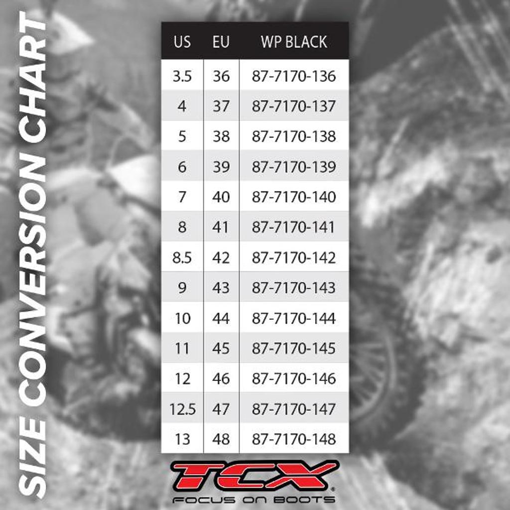 DOES ALLTCX FOOTWEAR OFFER THE SAME FIT? Generally, yes, even though the conversion of sizes is indicative, since everyTCX model is developed according to specific parameters and usage requirements, using fitting lasts and materials designed specifically to provide outstanding comfort. There could however be some differences in fit between two different models of the same size.
